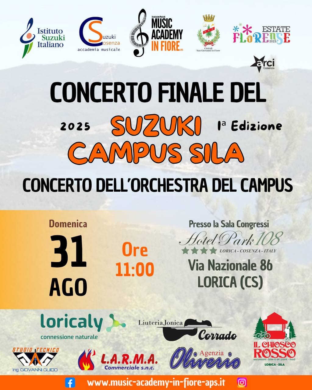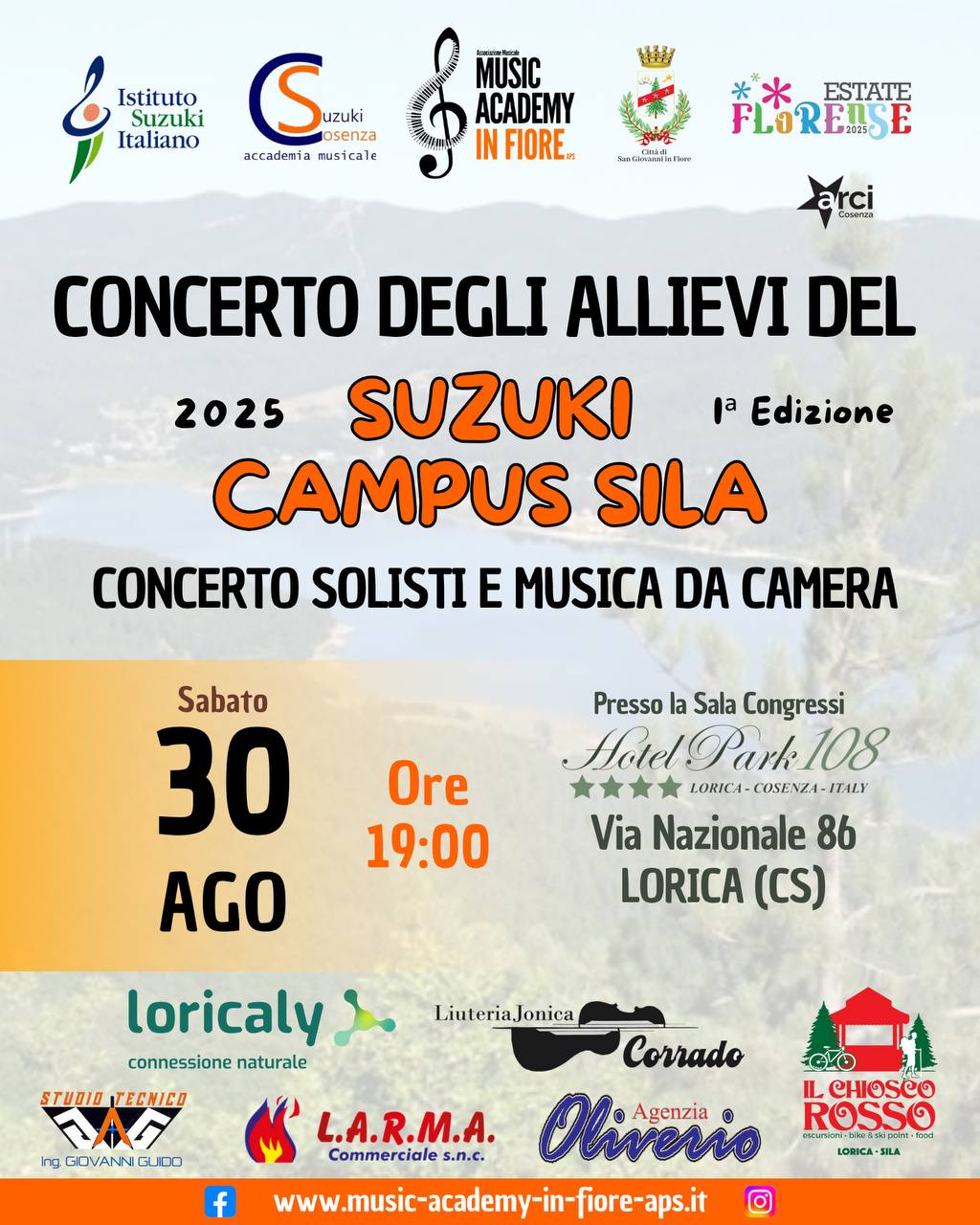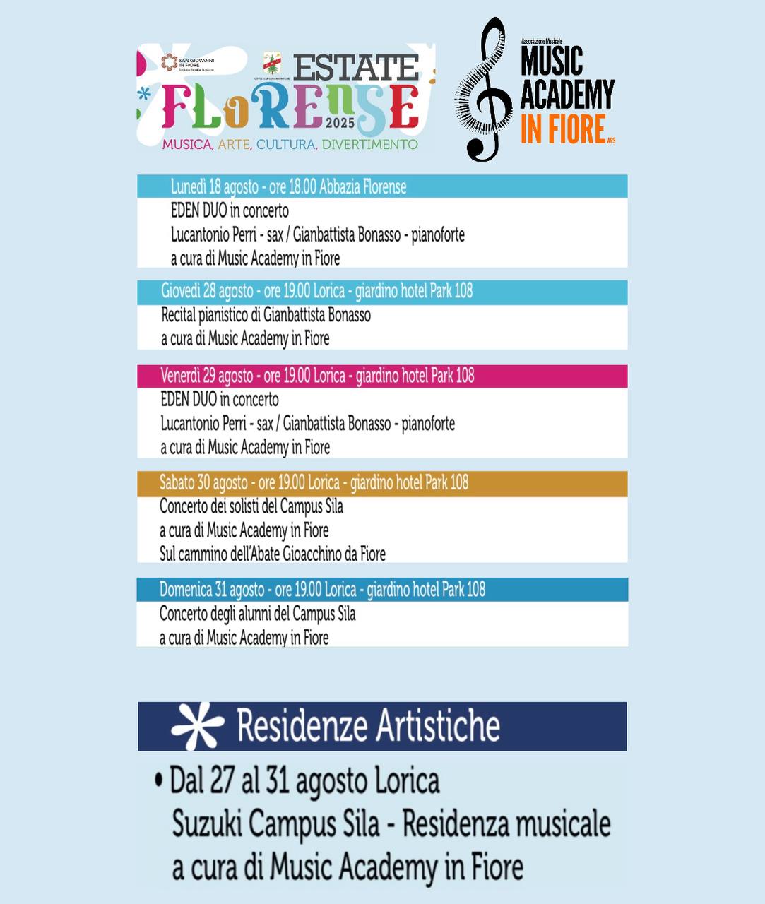 La Music Academy in Fiore, grazie al patrocinio del Comune di San Giovanni in Fiore in collaborazione con l'Accademia Musicale SUZUKI COSENZA, ha organizzato una serie di eventi musicali emozionanti in occasione del calendario dell'Estate Florense 2025 a Lorica!