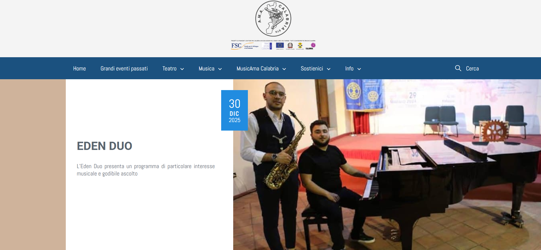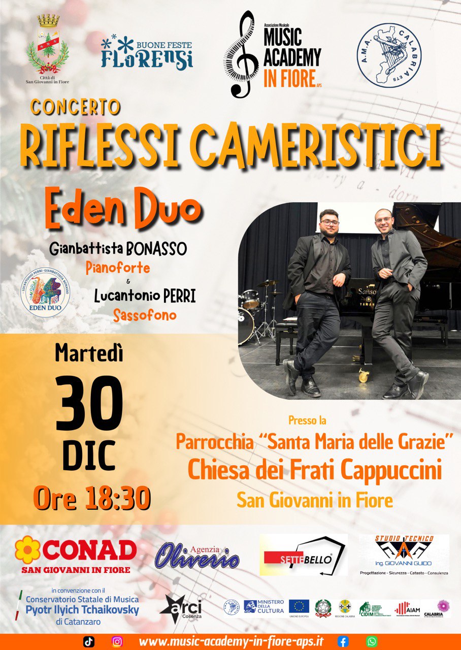 La Music Academy in Fiore in collaborazione con A.M.A. Calabria e il patrocinio del Comune di San Giovanni in Fiore vi aspetta per un grande appuntamento con la Musica a cui non potete mancare L'EDEN DUO nasce nel novembre 2024 al Conservatorio "Stanislao Giacomantonio" di Cosenza sotto la guida del Maestro Angela Meluso. Formato da Gianbattista Bonasso (pianoforte) e Lucantonio Perri (saxofono), si distingue per l'attenzione al repertorio cameristico. In breve tempo ha ottenuto numerosi riconoscimenti in concorsi nazionali e internazionali e ha svolto un'intensa attività concertistica e formativa, partecipando a masterclass con importanti docenti tra cui Nicolas Arsenijevic, Fabrizio Mancuso, Nele Tiebout, Bart VanBeneden, Guerino Bellarosa, Vittorio Quinquennale e David Salleras